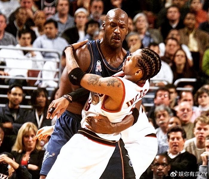 2003年4月16日乔丹职业生涯最后一场比赛就发生在费城主场,乔丹打了28分钟拿到15分,艾弗森上场42分钟拿到35分,即使面对暮年乔丹艾弗森也会拼尽全力,这其实就是对乔丹最大的敬重。